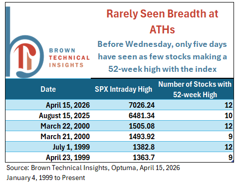Only 12 of the S&P 500 stocks hit new highs during yesterday’s record setting rally, but they were enough to send the index to a 7,022 close. (Source: Brown Technical Insights)