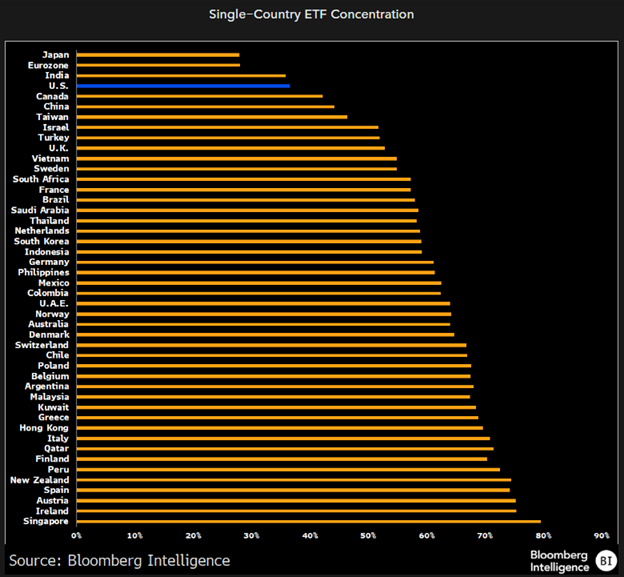 The U.S. has one of the lowest market concentrations when compared to its global peers. The top 10 stocks in the S&P 500 make up to 40% of total market cap. (Source: Bloomberg Intelligence)
