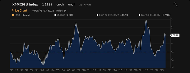 In past periods where core PPI has soared over CPI, producers have faced margin pressures. And when that happens, it tends to result in poor margins, earnings misses and a sell-off in the stock market.