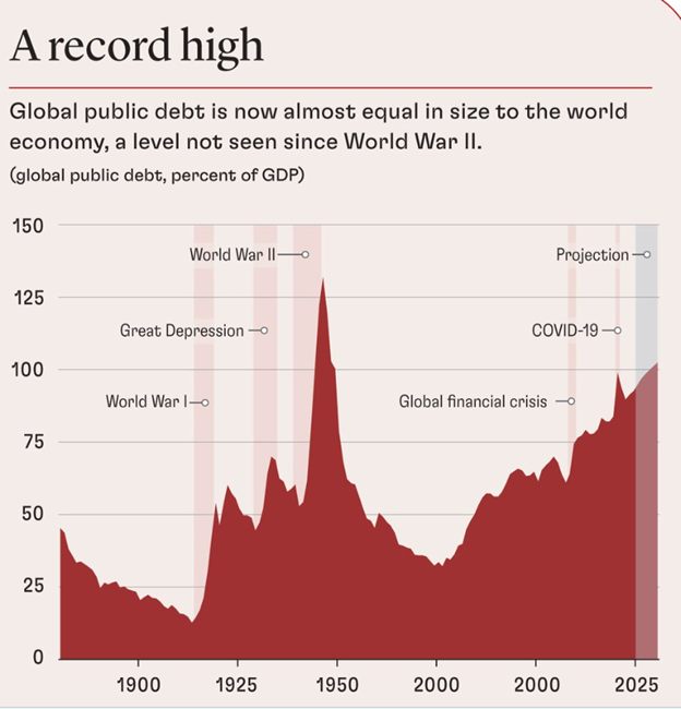The IMF warning regarding the U.S. Government’s deteriorating finances comes alongside a global warning that debt has reached heights last seen during the epic pandemic lockdown crisis and near the end of World War II. (Source: Fortune Magazine)
