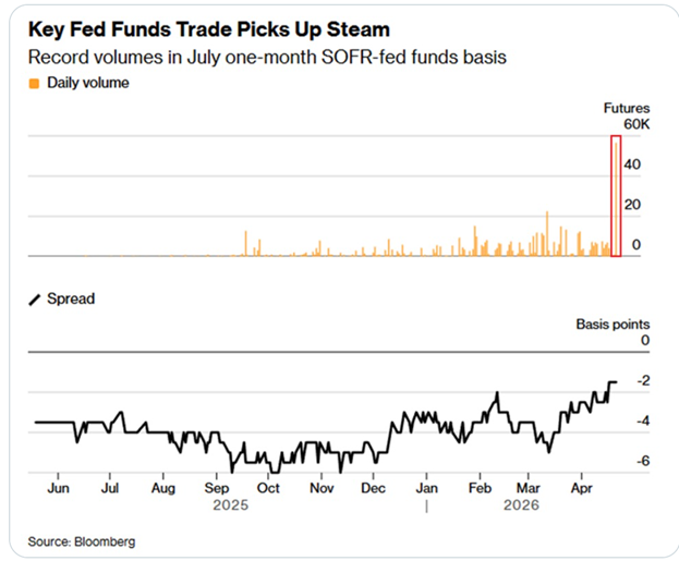 Trading volume in futures tied to the gap between SOFR and the federal funds rate reached 56,590 contracts this week, the highest level on record. These contracts reflect expectations about borrowing costs.