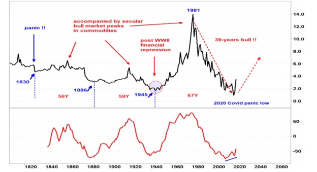 Even if it’s not politically expedient, interest rates have historically run on 50-60 year cycles since the founding of the republic 250 years ago. The post World War II spike then sell-off may have reached a cyclical bottom. Long-term interest rates have little room to go anywhere but up from here. (Source: Thierry fom arvy on X)