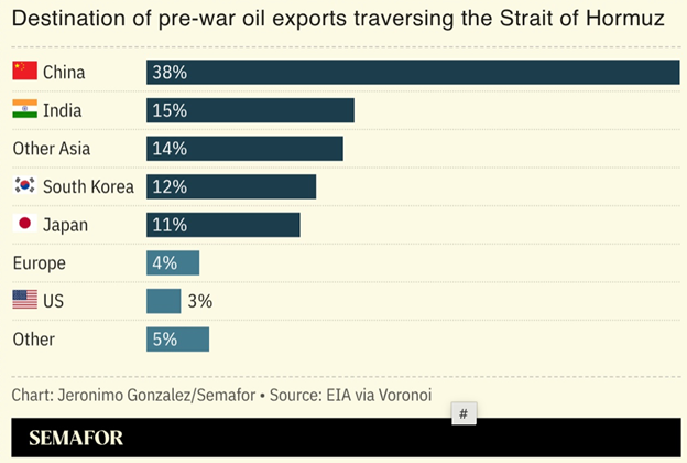 Asian economies account for the highest share of trade disruptions through the Strait of Hormuz since the war began on February 28. (Source Semafor)