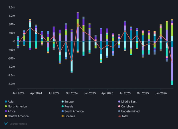 Shrinking exports from east of Suez — namely the Middle East and Asia — are redrawing global transport fuel trade routes. (Source: Vortexa)