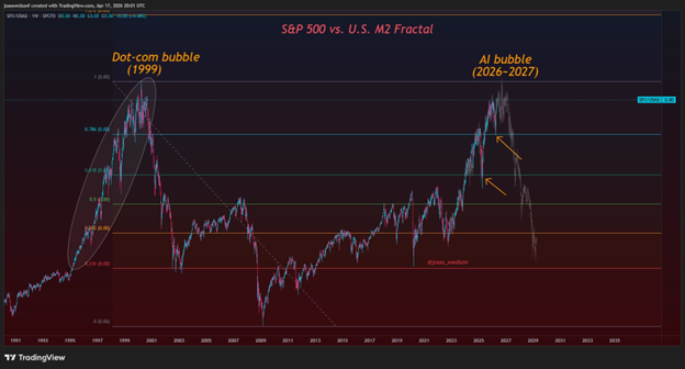 Dividing the S&P 500 by the M2 money supply gives a clearer picture of how late the market is in the AI boom/bust cycle. (Source: Joao Wedson)