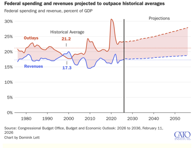The 2025 budget package expanded deficits going into this year. Congress is now preparing another reconciliation bill to fund additional military spending tied to Iran. Interest payments rise as the Treasury rolls over debt at higher yields.