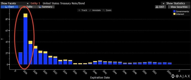 Over $8 trillion in U.S. debt is rolling over this year. What happens if Treasury throws a debt auction and the bond vigilantes don’t show up? We may find out… soon. (Source:Ajax)