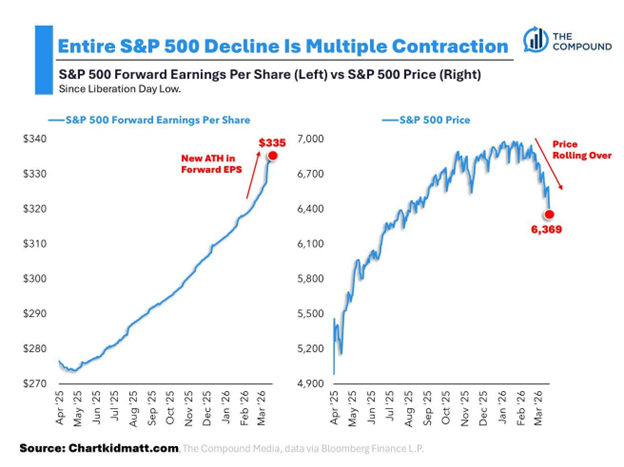 Even though the market is nearing correction territory, corporate earnings have continued to rise, offering investors a more compelling valuation. (Source: The Compound)