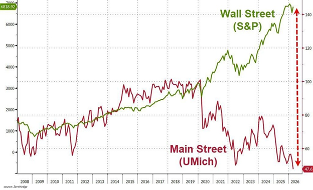 A trend that started during the pandemic, consumer sentiment’s disconnect from the stock market, has increased dramatically. (Source: The Kobeissi Letter)
