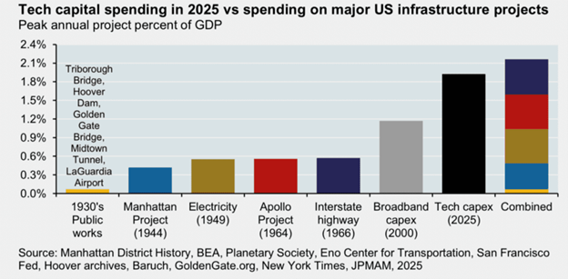In short, energy markets are reenacting the oil shocks of the 1970s. AI spending is bigger than the dot-com boom – in real and nominal terms – and investors may be running out of capital to buy the dip.